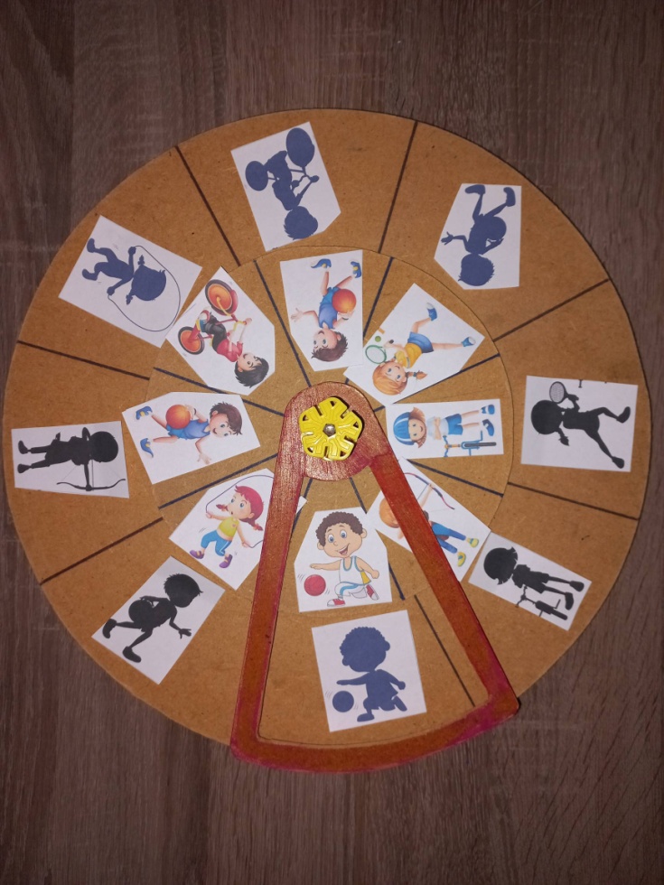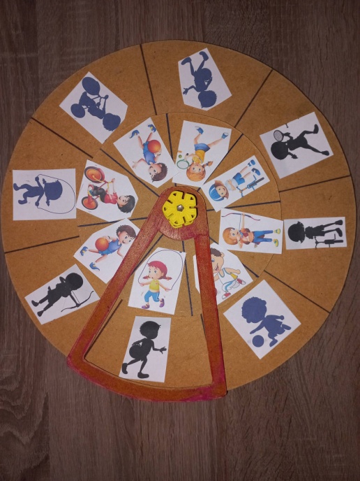 Ход игры: Воспитанники рассматривают картинки с различными видами спорта на малом круге. Затем с помощью зрительного наложения дети находят на большом круге инвентарь, оборудование необходимое для данного вида спорта.