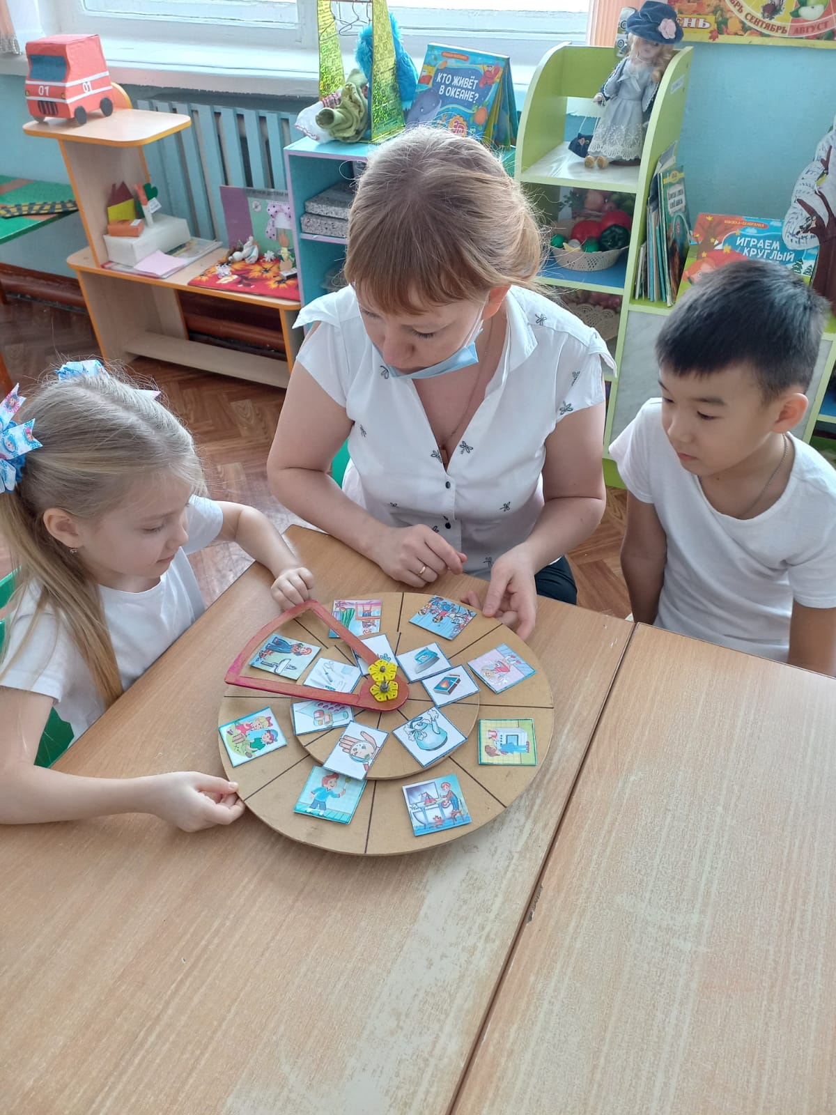 Ход игры: Воспитанники рассматривают сюжетные картинки на большом круге. Затем с помощью зрительного наложения дети находят на малом круге действия, подходящие данной ситуации. Объясняют свой выбор.
