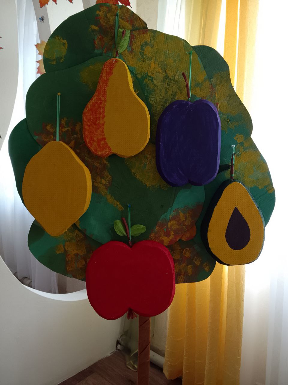 7 игра. Формировать способности численного сравнения. Сколько фруктов (овощей) растёт на дереве (грядке), а сколько лежит в корзинке.