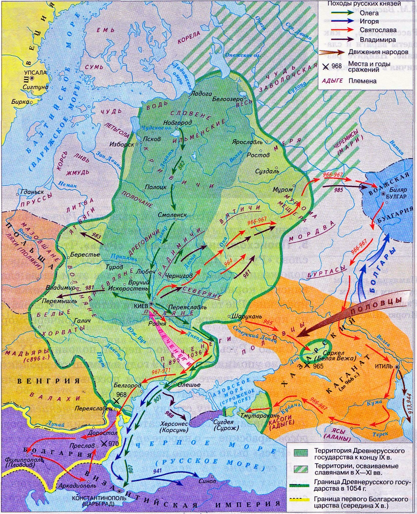 ??? вошел в историю, как князь-воитель. В 964 г. он направился со своей дружиной к Волге, в землю вятичей, которых, скорее всего, сделал своими союзниками, освободив от необходимости платить дань хазарам. В 965-966 гг. русские войска уже воевали в районе Средней и Нижней Волге. В результате с исторической карты исчезло такое могущественное государство, контролирующее транзитные торговые пути, как Хазарский каганат, а Волжская Булгария была вынуждена выплатить дань киевскому князю и согласиться пропускать русских купцов через свою территорию. Русскими форпостами в Великой Степи стали бывший хазарский Саркел, теперь носивший название Белая Вежа, а также греческий торговый город с многонациональным населением - Тамарахта, которую русские летописи будут именовать Тмутараканью. Успешной оказалось и вторжение ??? на Северный Кавказ в земли союзников Хазарии - аланов, ясов и касогов. Возвращаясь в Киев, ??? нанес поражение вятичам, заставил их признать свою верховную власть и платить дань Киеву. Великий князь киевский ??? вошёл в историю и как неутомимый строитель, и как князь, укрепивший русскую христианскую культуру. Летописец писал о нём: «Вера христианская нача плодиться и расширяться». Мудрый правитель не только воевал с Византией, но и приглашал оттуда умелых мастеров. Именно они создали на Руси новые храмы, самым знаменитым из них стал величественный собор святой Софии в Киеве. ??? основывал монастыри, много сделал для организации церкви и упрочения христианской веры на русских землях. Отдельно можно сказать о развитии образования. Именно при нём в Новгороде была открыта вторая самая большая школа (первая в Киеве), а в Софийском соборе была создана библиотека. |