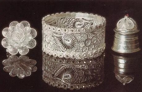 это ажурный или напаянный на металл узор из проволоки. из серебра, но узоры делают и из золота и других металлов. Серебро и золото очень мягкие, их просто вытянуть в очень тонкие проволочки. Проволока для сканного узора (серебряная, реже — золотая) бывает гладкой или свитой в веревочки и спирали. |