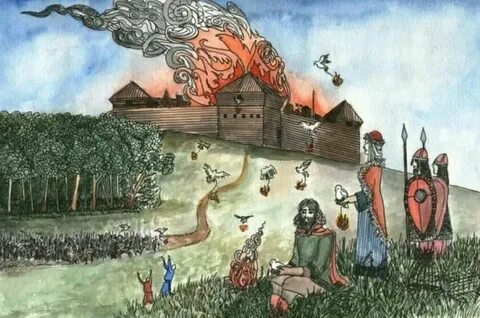 Древляне же с радостью вошли в город и поведали обо всем людям, и обрадовались люди в городе. ??? же, раздав воинам – кому по голубю, кому по воробью, приказала привязывать каждому голубю и воробью трут, завертывая его в небольшие платочки и прикрепляя ниткой к каждому. И, когда стало смеркаться, приказала ??? своим воинам пустить голубей и воробьев. Голуби же и воробьи полетели в свои гнезда: голуби в голубятни, а воробьи под стрехи, и так загорелись – где голубятни, где клети, где сараи и сеновалы, и не было двора, где бы не горело, и нельзя было гасить, так как сразу загорелись все дворы. И побежали люди из города, и приказала ??? воинам своим хватать их. А как взяла город и сожгла его, городских же старейшин забрала в плен, а прочих людей убила, а иных отдала в рабство мужам своим, а остальных оставила платить дань. |