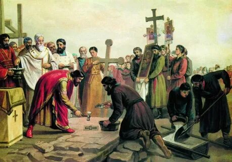 Закладка Десятинной церкви воздвигнутый Владимиром Святославичем в 989—996 годах в киевском детинце (Старокиевская гора). Десятинная церковь названа так, потому что на её содержание шла десятина княжеских доходов. Святой князь Владимир при закладке краеугольного камня в присутствии митрополита Леонтия, епископов греческих и русских, бояр и бесчисленного народа изрёк: «Даю церкви сей святой Богородицы от именья моего и от град моих десятую часть»[2]. |
