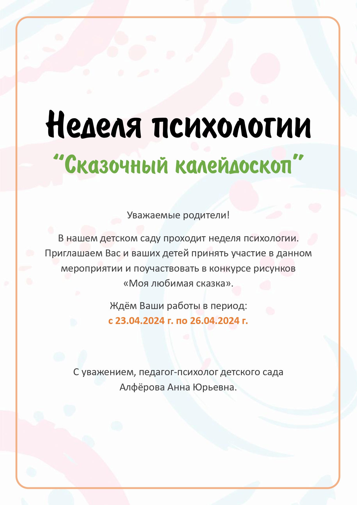 Конкурс рисунков «Моя любимая сказка». | Понедельник-пятница с 22.04.2024 г. по 26.04.2024 г. | Выявление, развитие и поддержка талантливых детей в области художественной активности. | Родители, дети | Раздевалка | Педагог-психолог, воспитатели групп |