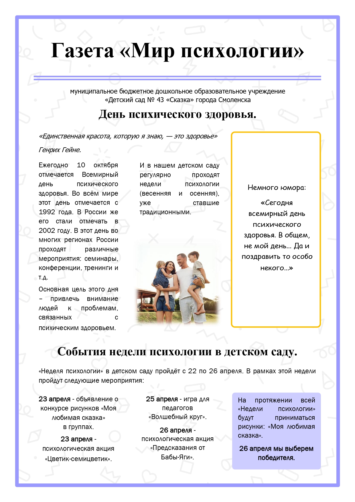 Выпуск тематической газеты «Мир психологии». | Понедельник 22.04.2024 г. | Информирование родителей и педагогов о проведении недели психологии. | Родители, педагоги | Раздевалки в группах | Педагог-психолог |