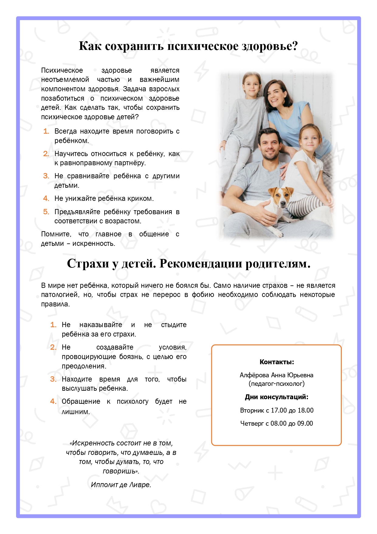 5. Кудряшова, Т. Ю. Экспериментальное исследование особенностей развития компонентов психологического здоровья у детей старшего дошкольного возраста / Т. Ю. Кудряшова // Вопросы психического здоровья детей и подростков. – 2019. – Т. 19, № 4. – С. 31-39.