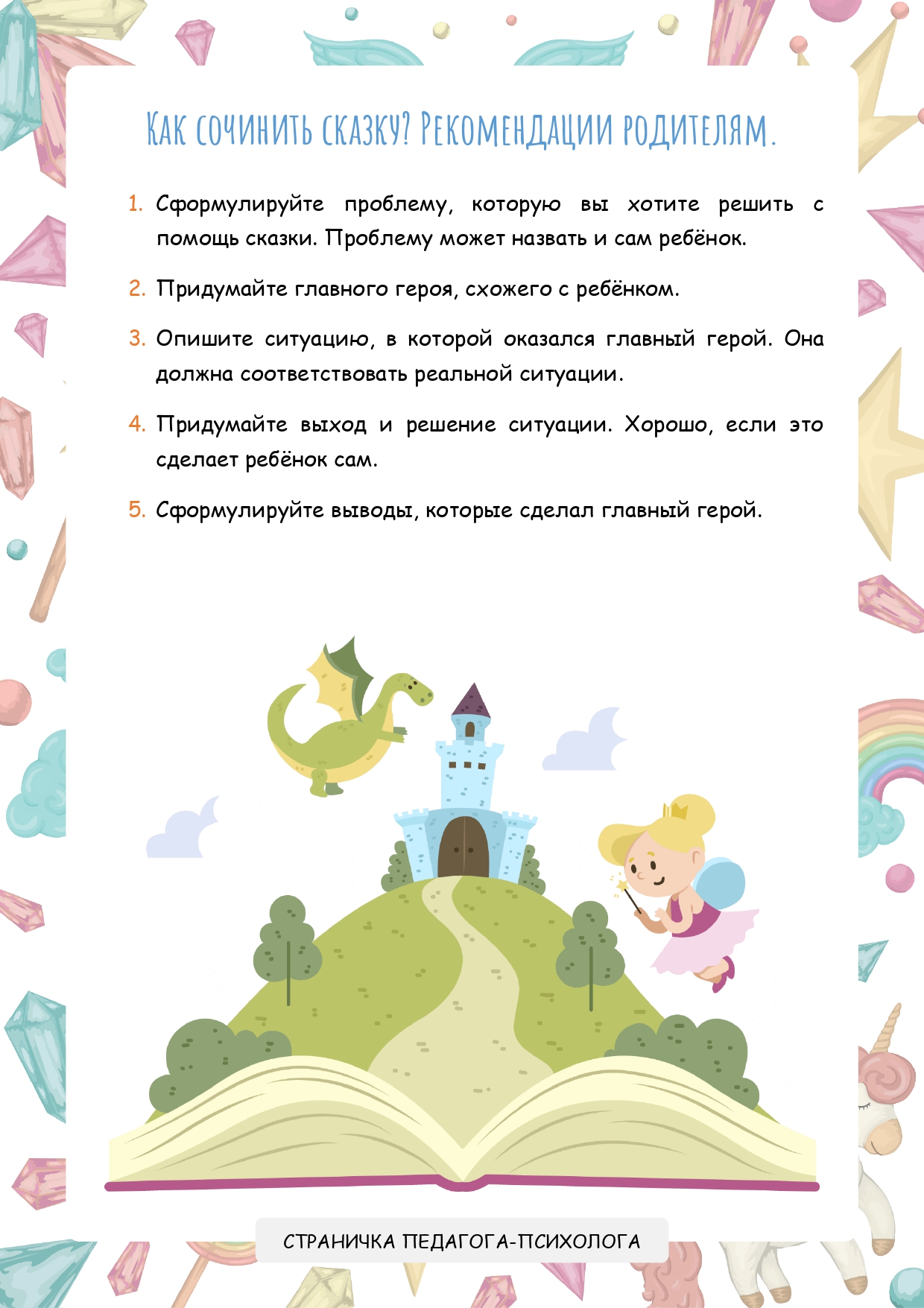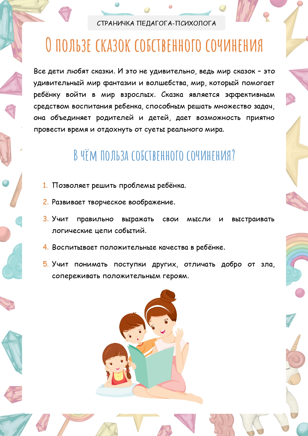 Стендовая информация для родителей «О пользе сказок собственного сочинения». | Четверг 25.04.2024 г. | Психологическое просвещение родителей. | Родители | Помещение групп | Педагог-психолог |