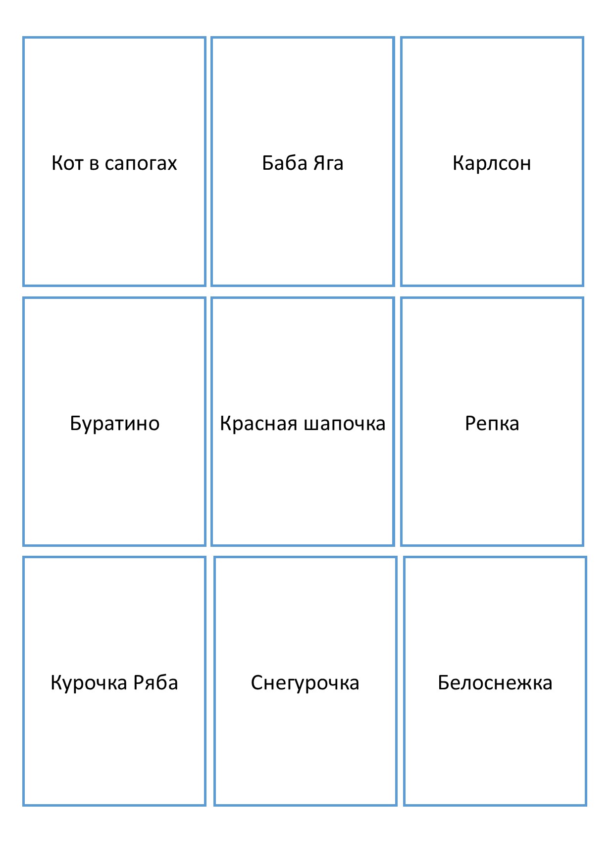 Описание:Из каждой команды выходят по одному участнику. Они берут карточку с изображением сказочного героя и не показывая её никому должны изобразить этого героя используя мимику, пантомимику, жесты. За правильно угаданного персонажа команда получает 2 балла.