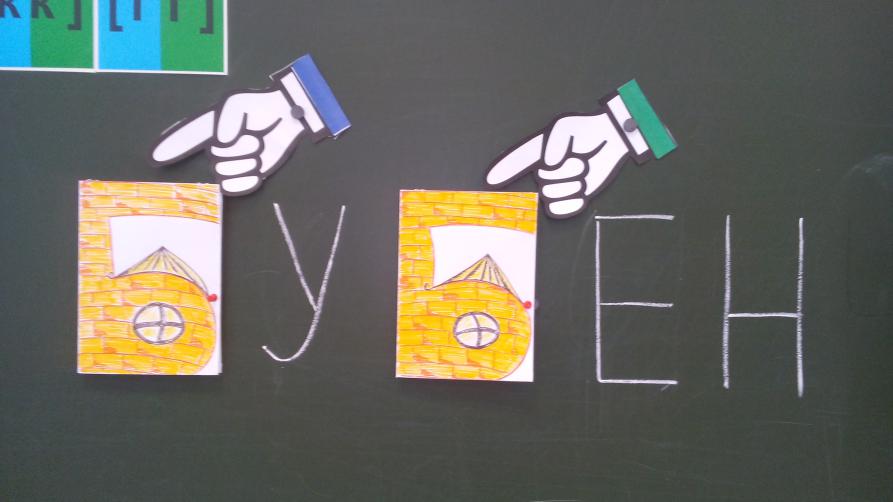 А) Две внешне абсолютно одинаковые буквы-домика, но одна - с твердым, другая - с мягким согласным внутри, крепятся к доске. Над ними крепятся указатели твёрдости/мягкости в виде указывающих рук либо под буквами - магниты синего и зелёного цветов. Обучающимся выдаются карточки с гласными буквами. Нужно прикрепить гласные рядом с нужной согласной буквой.
