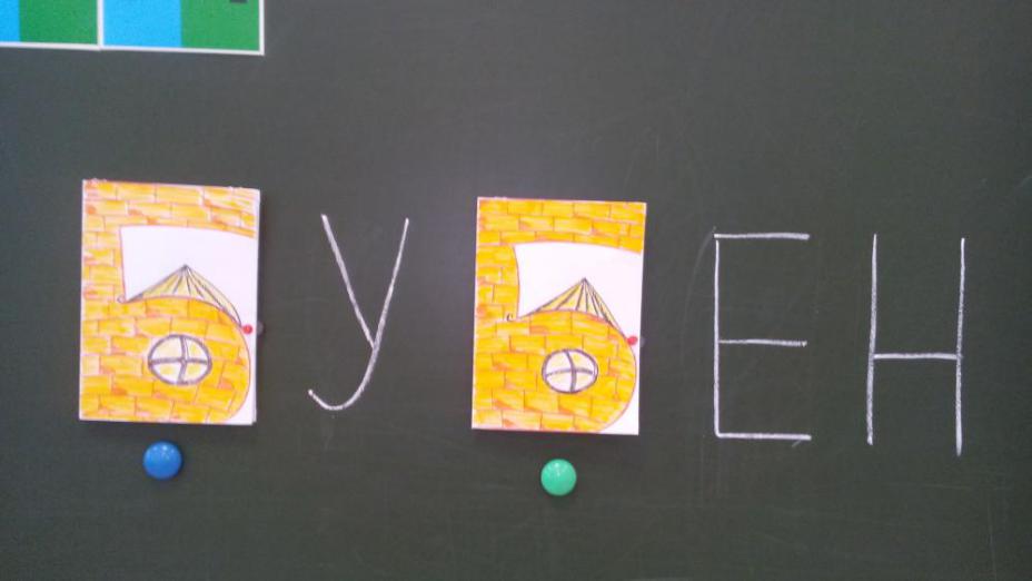 Б) На доске пишется слово, вместо одной или двух букв в нём прикрепляются домики-буквы. Какие звуки они обозначают? Что на это указывает? Учитель предлагает сначала обозначить свои предположения под домиками цветными магнитами (синий, зелёный), затем открыть домик-букву и проверить, какой звук внутри, затем рассказать своими словами правило, которым руководствовались обучающиеся. (Приложение 3.)