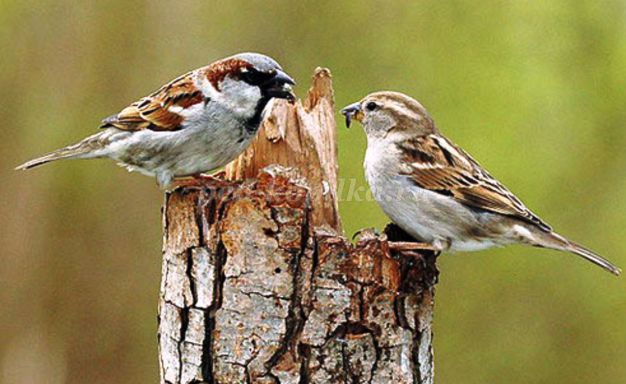 Воробей домовый Общая окраска оперения — сверху коричневато-бурая, снизу - беловатая или серая. Самец отличается от самки наличием большого чёрного пятна, охватывающего подбородок, горло, зоб и верхнюю часть груди. У самки голова и горло серые, а над глазом имеется серо-жёлтая полоса. Глаза карего цвета. Голос: «Цвинь-чик-чирик». По земле передвигаются короткими прыжками. Питаются семенами зерновых культур, ягодами, почками деревьев. |