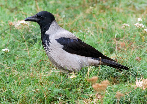 Ворона серая Размером с голубя. Туловище серое, голова, “манишка”, крылья, хвост - черные со слабым металлическим блеском. Голос: «Карр» По земле передвигается широкими шагами, в случае опасности начинает «скакать». Всеядна, питается насекомыми, птенцами и яйцами, грызунами и ящерицами, лягушками, рыбой; растительной пищей, пищевыми отбросами и падалью. |