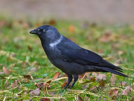 Галка обыкновенная Птица размером с голубя. Голова, грудь и спина преимущественно серые, с более светлыми серебристыми пятнами на затылке и щеках. Крылья и хвост чёрные, с синим отливом. Глаза светлые. Голос: «Кай», «Кьяа», «Кьяк». По земле передвигаются шагами. Всеядна, в период размножения преобладают животные корма, в остальное время — растительные. |