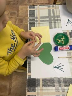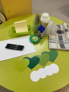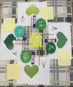 -раздаточный: картонный шаблон (сердечко) для основы работы, бумажные круги с зелеными полосками (имитация веточек), салфетки или тонкая бумага гофре желтого цвета, клей ПВА, клей карандаш, кисть, подкладной лист, клеенка.
