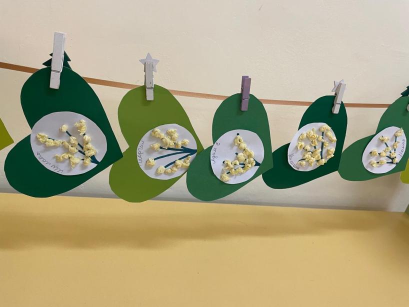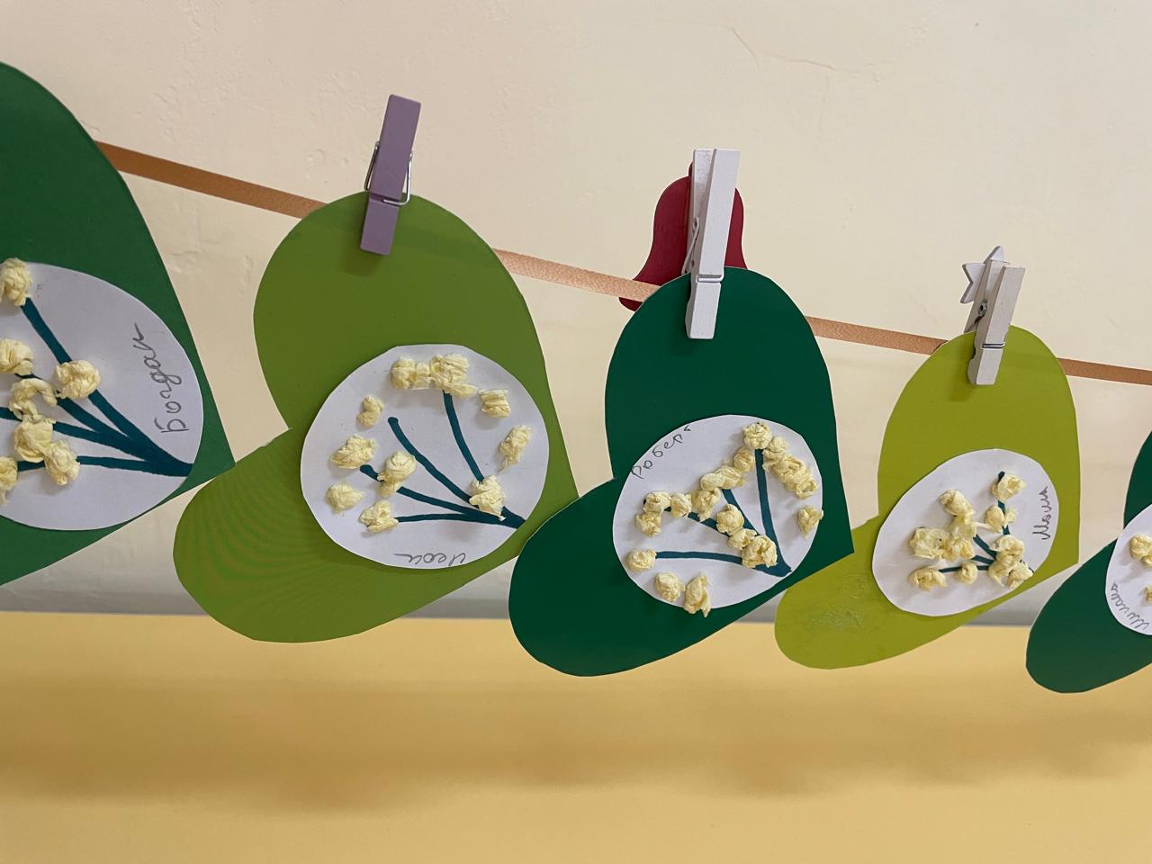 1.Внимательно рассмотреть с детьми цветные иллюстрации цветущего дерева и крупным планом соцветия акации серебристой;