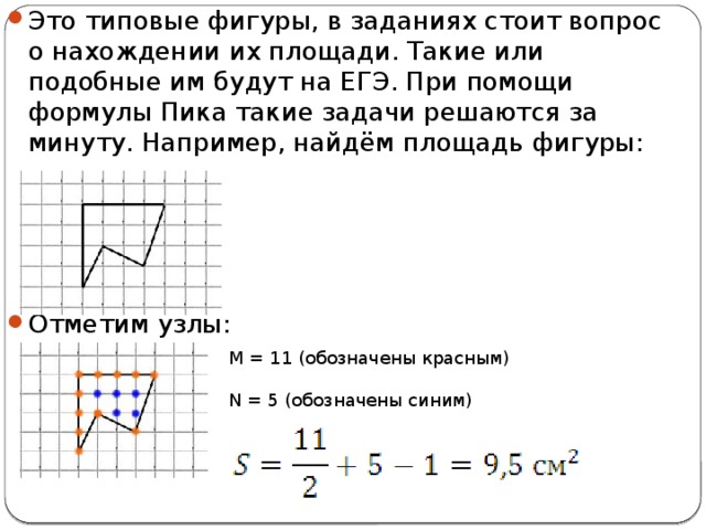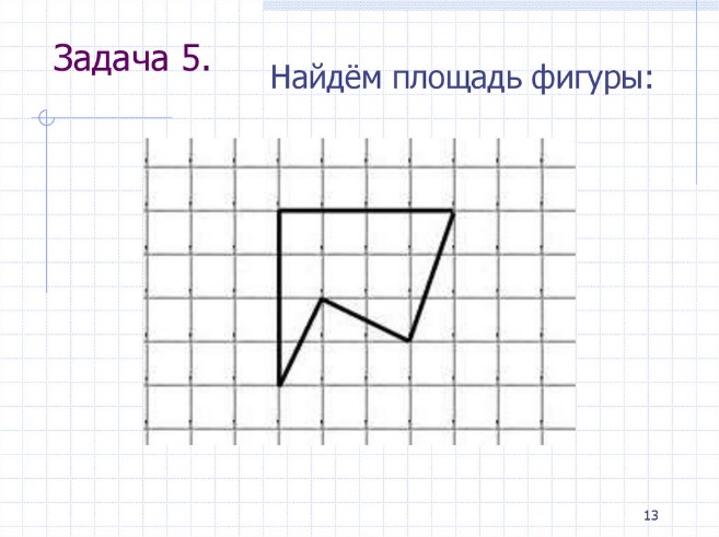 8. Сколько погонных метров линолеума шириной 2 м потребуется для покрытия пола шириной 5 м и длиной 8 м Задание2. Найти площадь фигуры различными способами: 1 способ – разбиение на части; 2 способ – достраивание; 3 способ – правило Пика. (в школьной программе нет) Есть очень простая формула, позволяющая вычислить площадь многоугольников с вершинами в узлах квадратной сетки. Формула, которая была открыта австрийским математиком Пиком в 1899 г. S = В + Г : 2 – 1, где S – площадь многоугольника, выраженная в площадях единичных квадратиков сетки. В – количество узлов сетки, лежащих внутри многоугольника. Г – количество узлов сетки, лежащих на границах многоугольника (включая вершины). Найдем площадь фигуры: