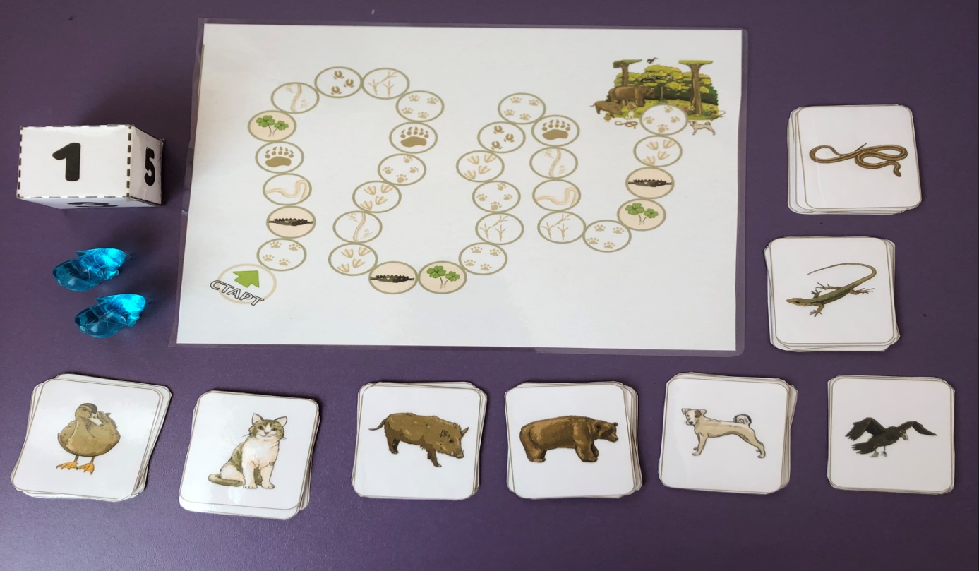 Оборудование: игровое поле с изображением следов животных и птиц, игральный кубик с цифрами, фишки, карточки с изображением животных и птиц.