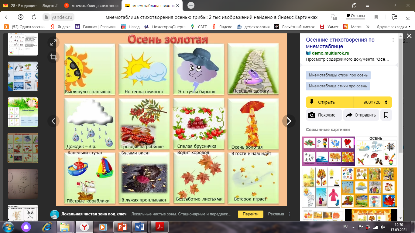 Воспитатель: "Королева леса прислала нам стихотворение. Давайте попробуем его выучить с помощью мнемокартинок!"