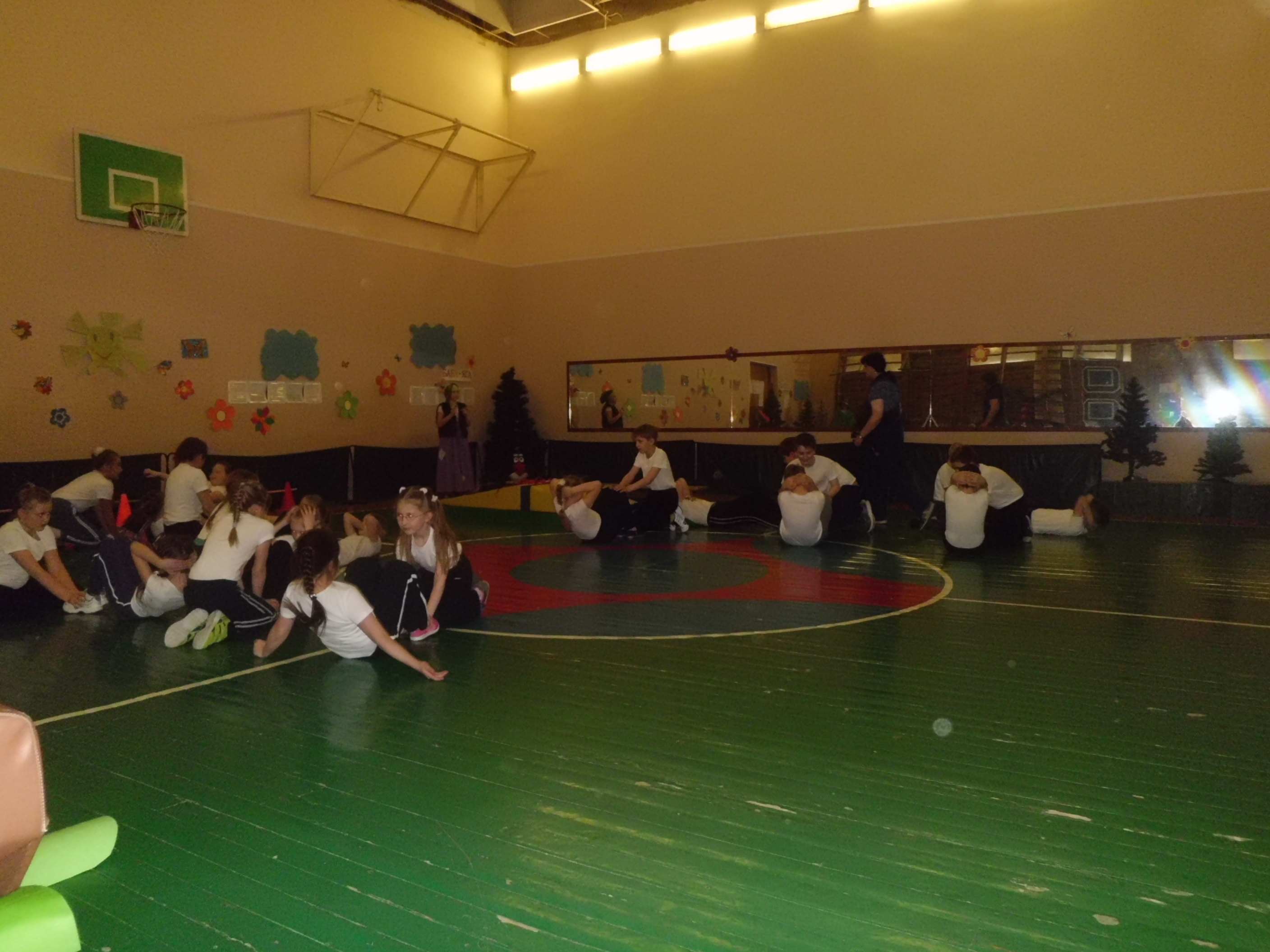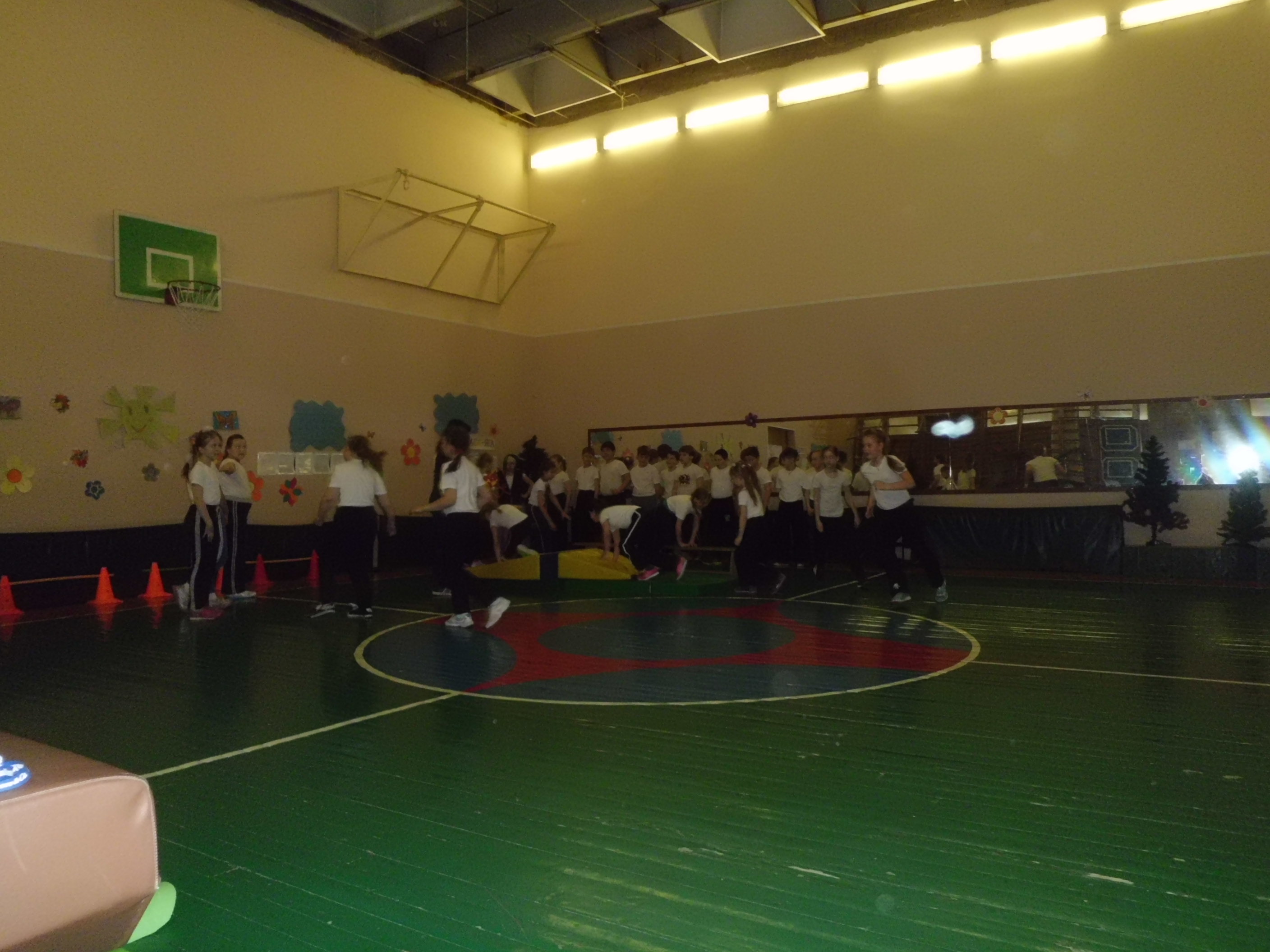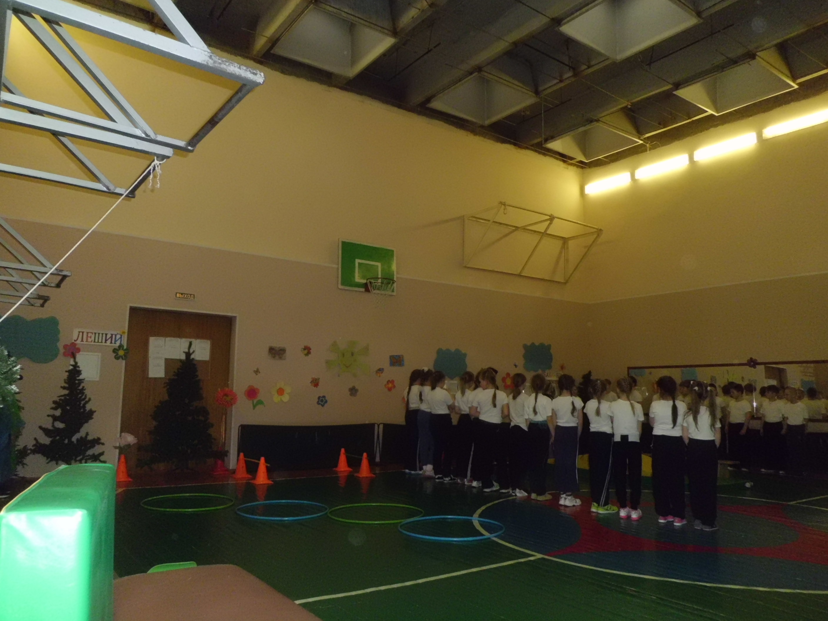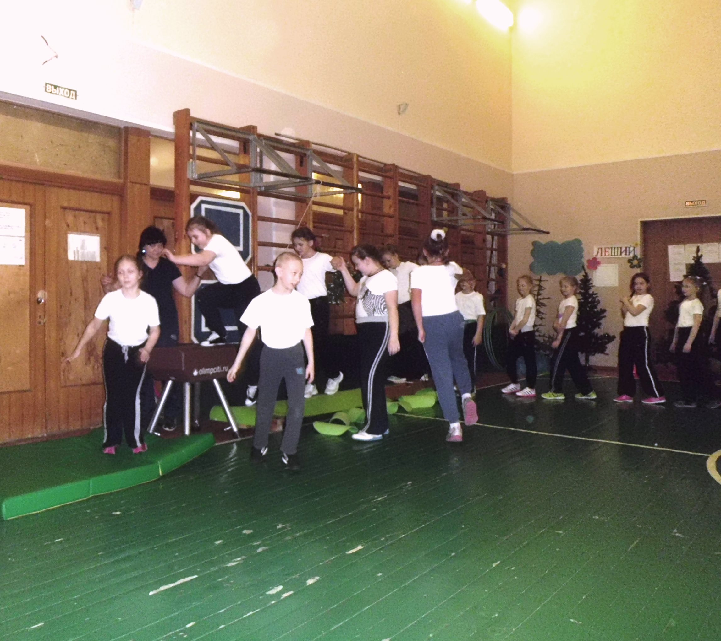 Инвентарь: обручи, гимнастические маты, ориентиры, гимнастическое бревно, кегли, кубики, магнитофон.