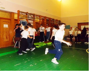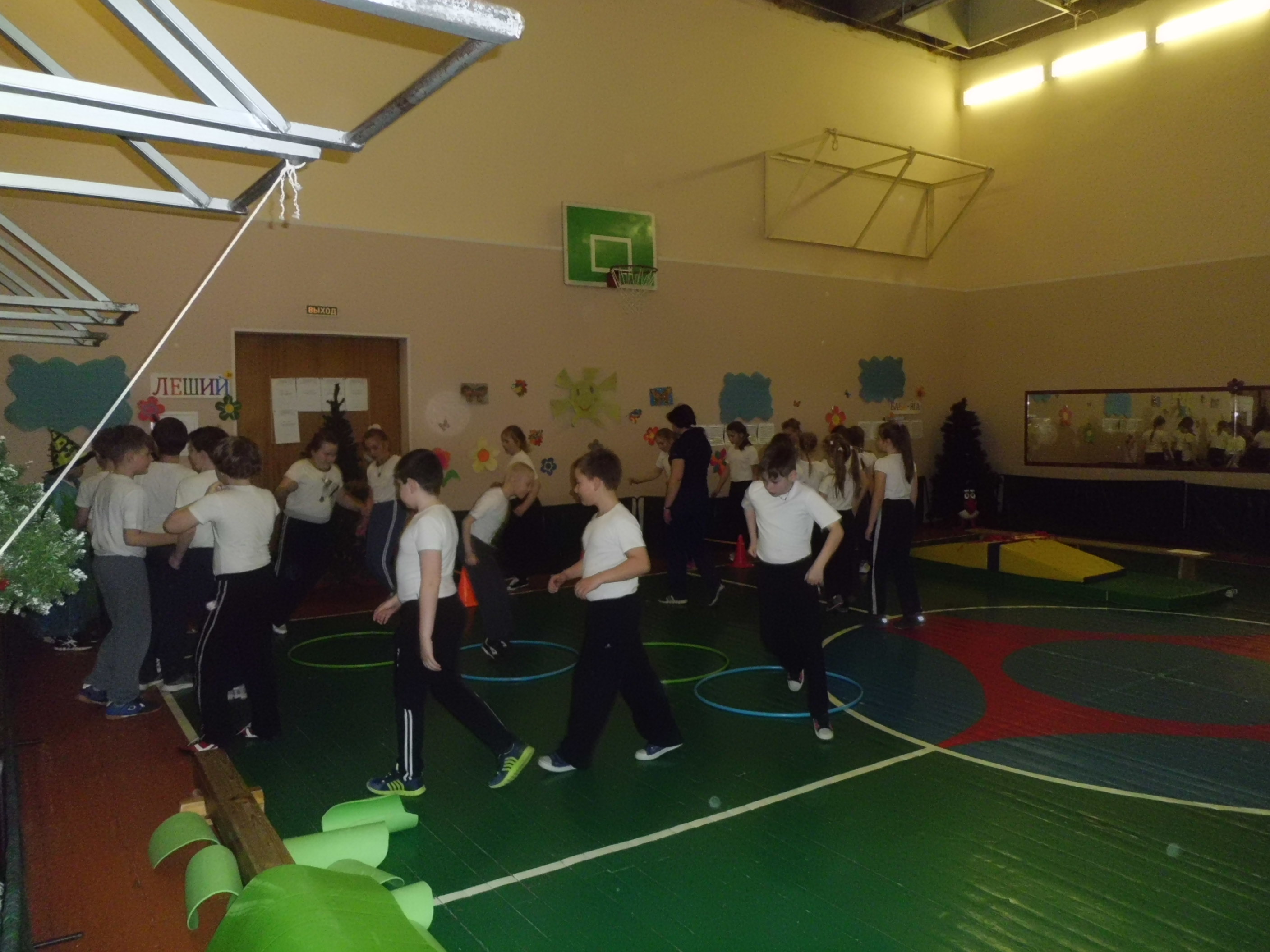 Ученики вмести с Бабой -Ягой преодолевая препятствия, идут к лешему.(На полу размещены горизонтальные препятствия, задача учеников, перепрыгнуть на двух ногах препятствие и переползти под горизонтальными препятствиями.(Учитель стоит на подстраховки).