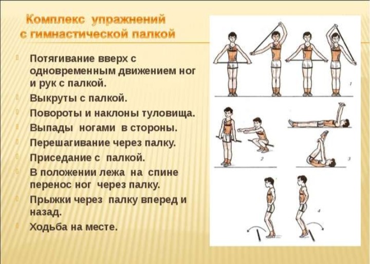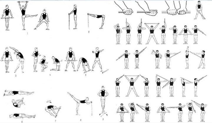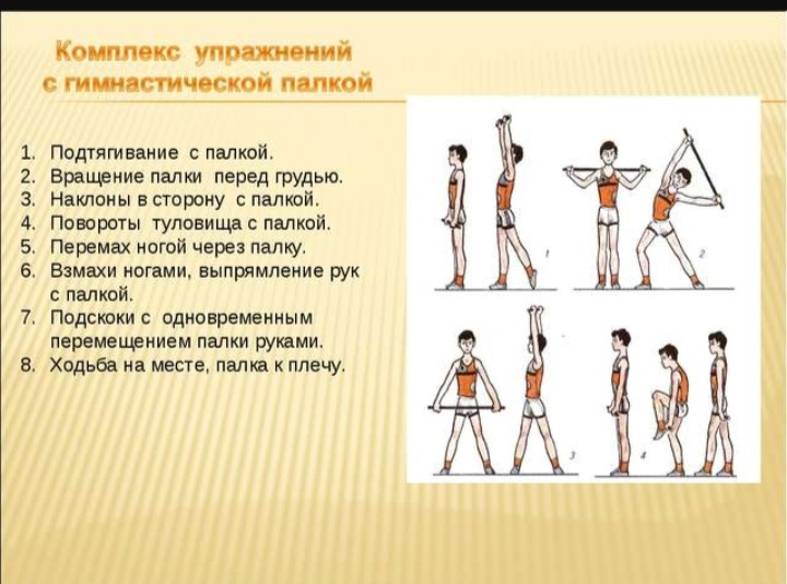 Для занятий понадобится свободное пространство, летом хорошо заниматься во дворе или парке, чтобы выполнять упражнения с максимальной амплитудой. Сама гимнастическая палка имеет стандартную длину — 120 см — и может быть сделана из пластика или дерева. Своеобразие упражнений с гимнастической палкой заключается в том, что фиксируются не только исходные и конечные положения рук, ног, туловища, но и путь движения палки. Это обеспечивает точность выполняемых движений с различной амплитудой, усиливает избирательное воздействие на различные группы мышц, позволяет точно развивать и совершенствовать координацию движений.