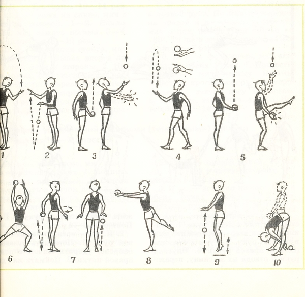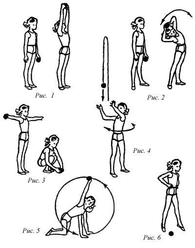 Упражнение 1. И.п. – о.с., мяч в левой руке (рис. 1). 1–2 – руки через стороны вверх, потянуться и передать мяч в правую руку – вдох; 3–4 – опустить руки вниз – выдох. Повторить то же самое, передавая мяч из правой руки в левую. Поднимая голову, следить за передачей мяча. Руки вверху должны быть точно над головой.