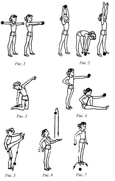 Упражнение 1. И.п.: ноги врозь пошире, руки в стороны, мяч в правой руке (рис. 1). 1–2 – перенести центр тяжести на левую ногу, переложить мяч под коленом в левую руку; 3–4 – и.п.; 5–8 – то же в другую сторону. Упражнение делать плавно, не спеша, потягиваясь при разведении рук в стороны и разворачивая ладони вверх. Дыхание произвольное.