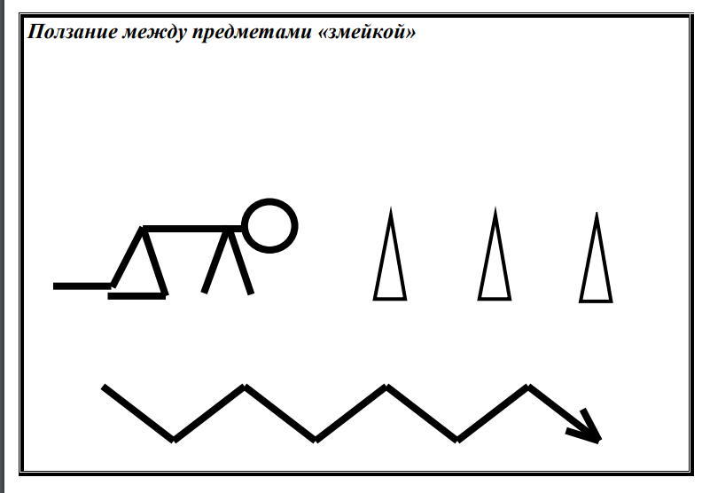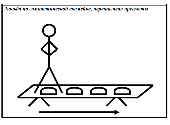 2.Содержательный этап | 1. И.П. – стойка ноги врозь, мешочек в правой руке, левая рука на поясе 1-8-вращение правой руки назад. 1-8-переложить мешочек в левую руку, то же, левой рукой 2. И.П. – стойка ноги врозь, мешочек в правой руке. 1.-наклон, руки в стороны. 2-переложить мешочек в левую руку. 3-руки в стороны 4-и.п. 5-8 - то же другой рукой. 3. И.П. – лёжа на животе, руки вдоль туловища, мешочек в правой руке 1- поднять спину, переложить мешочек в левую руку за спиной 2- и.п., мешочек в левой руке 3- 4-то же, другой рукой. 4.И.П. сед упор сзади, колени согнуты, мешочек зажат стопами. «Бабочка», махи коленями в стороны. 5.И.П. сед, ноги прямые, мешочек между стопами. 1-2-3 прямыми руками тянемся к мешочку 6.И.П.-о.с., руки на пояс, мешочек на полу 1-8-прыжки вокруг мешочка на двух ногах вправо. 9-16-прыжки вокруг мешочка на двух ногах влево. Инструктор: В одну колонну становись, налево в обход по залу шагом марш! - Легкий бег! - Река! (Воспитанники бегут «змейкой» между мешочками.) - Берег! (Обычный бег в колонне.) - Река! - Берег! - Приставной шаг вправо! Влево! Восстанавливаем дыхание. - Раз, два, три- место в шеренге найди!(Дети выполняют построение в шеренгу). - Ребята, мышцы разогрели? Тогда приступим к выполнению заданий. А вот каких, вы сейчас расскажете. Инструктор показывает схемы основных видов движений. - Итак, первая схема. Глаза внимательно глядят, голова- думает, какое задание выполняет человечек? (На схеме - перешагивание предметов на гимнастической скамье). (Выслушать ответы детей. Похвалить ребят, которые правильно прочитали схему. Обратить внимание на положение рук и ног при выполнении упражнения.) - Вот, посмотрите, на желтой стойке схема, которую мы с вами рассматривали. А Елена Геннадьевна на скамье приготовила вам инвентарь для прохождения «желтой» станции. - Вторая схема. Посмотрите внимательно.(На схеме - ползание между предметами).Выслушать ответы ребят. В это время воспитатель расставляет конусы и знакомит детей с синей стойкой со схемой и «синей» станцией. - Вот и вторая станция готова. - Рассмотрите, пожалуйста, третью схему.(На схеме произвольные прыжки на координационной лестнице).Выслушать ответы детей, похвалить правильно ответивших. Воспитатель раскладывает координационную лестницу и показывает ребятам стойку зеленого цвета со схемой. - Итак, «зеленая» станция готова. И нас опять выручают разноцветные мешочки. - Порядок! (Ребята берут по одному мешочку). - Посмотрите на цвет своих «билетов» и найдите нужную станцию. (Дети с желтыми мешочками идут на « желтую» станцию, с синими- на «синюю», с зелеными- на «зеленую». Мешочки красного цвета убраны, их надо заменить синими, желтыми и зелеными, так как всего 3 станции). - Еще раз внимательно посмотрите на схему своей станции, всем понятно задание? Команды в колонны стройся! Приступаем к выполнению заданий! Воспитатель страхует и контролирует правильность выполнения упражнения на скамье. Обращает внимание на осанку, положение рук и ног. Инструктор контролирует выполнение заданий на остальных станциях. Пока ребята выполняют упражнения, инструктор меняет контейнеры с «билетиками» -мешочками. - Стоп! Закончили выполнять упражнения!(Дождаться тех, кто доделывает упражнения). -Берем «билетики» и переходим на свои станции.(Дети берут мешочки из контейнеров и ищут свою станцию по цвету мешочка.) -Посмотрите внимательно на схе