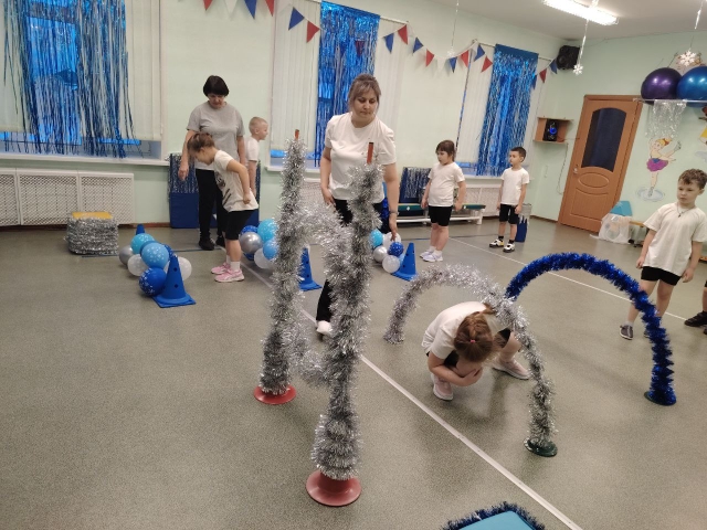 Подлезание: 2 дуги (или стойки с натянутой резинкой с голубыми лентами — «ледяная арка»).