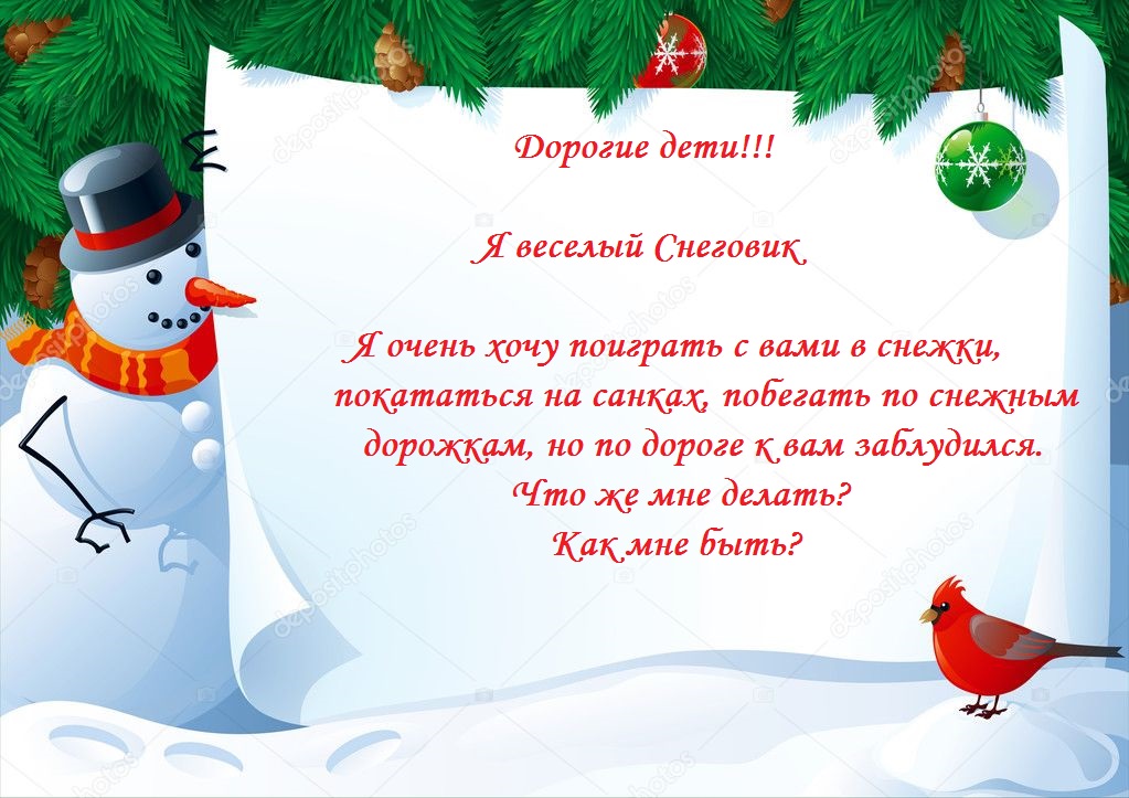 Письмо: «Дорогие дети! Я веселый Снеговик очень хочу поиграть с вами в снежки, покататься на санках, побегать по снежным дорожкам, но по дороге к вам заблудился. Что же мне делать? Как мне быть?»
