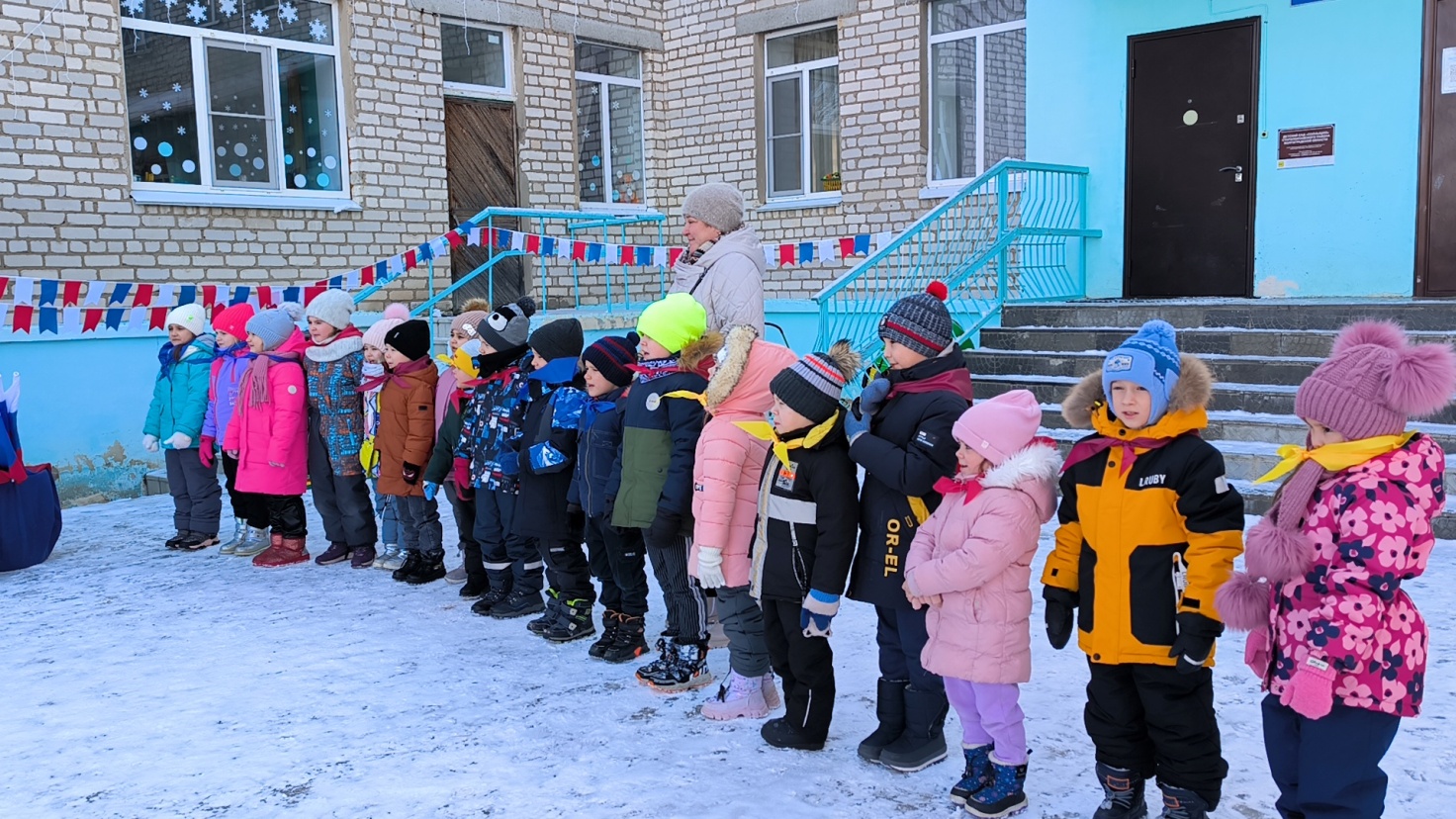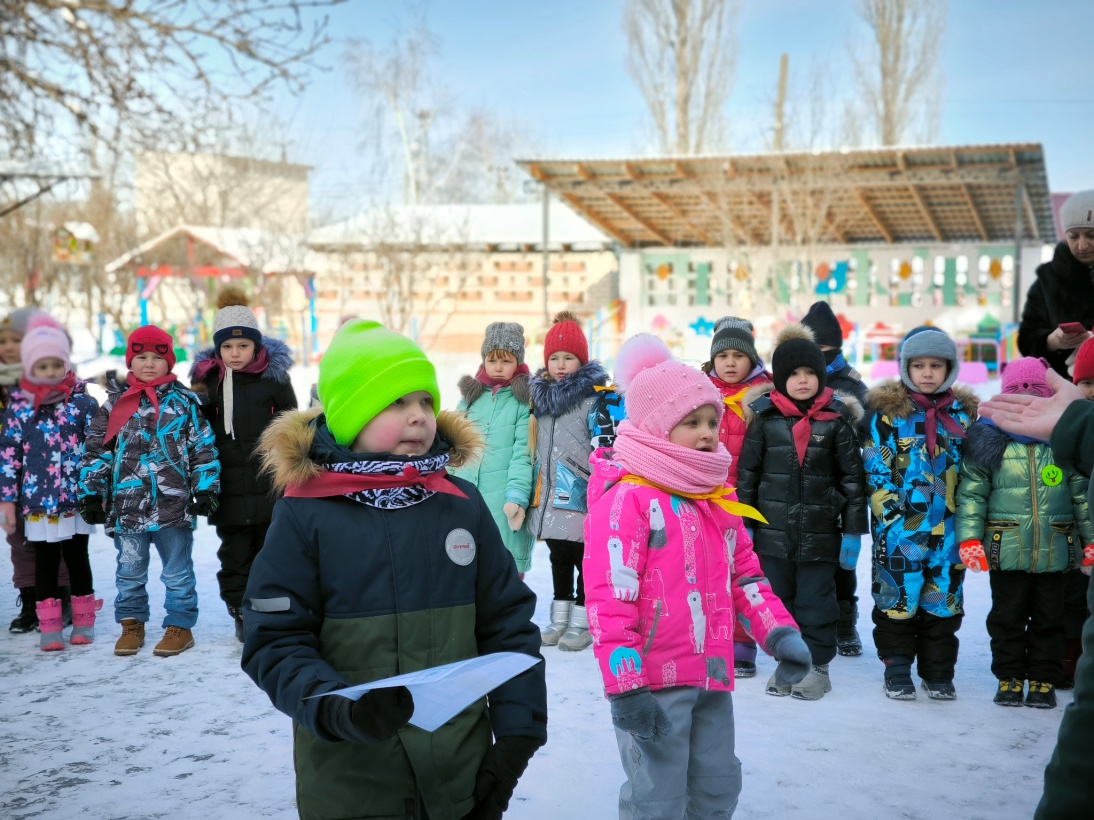 Звучит маршевая музыка, дети под руководством инструктора по физической культуре собираются на площадке (перед центральным входом в детский сад), выстраиваются по периметру площадки. В одежде каждой команды присутствует атрибут (галстуки трех цветов – красный, желтый, синий, цвета Старополтавского флага).