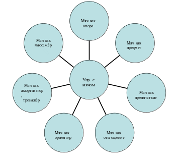 В зависимости от поставленных задач подбирают и соответствующие средства фитбол-гимнастики, которые можно использовать на занятиях (приложение 3).