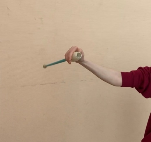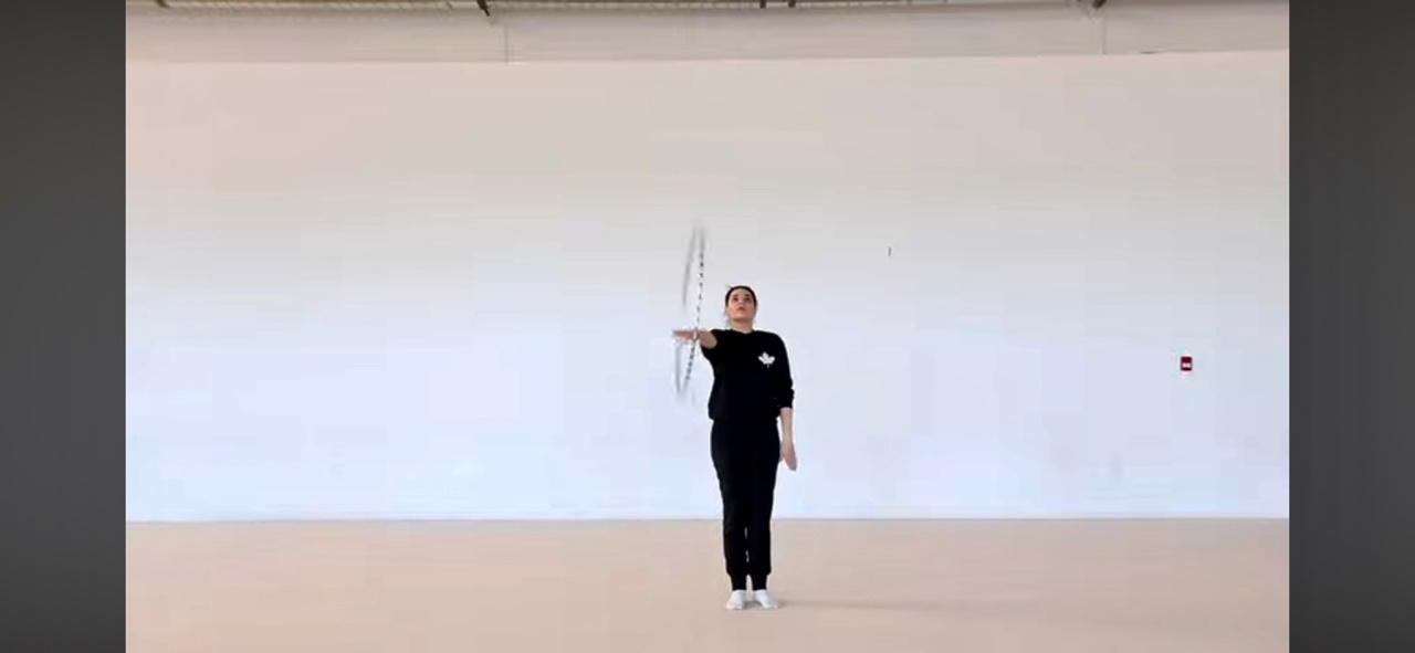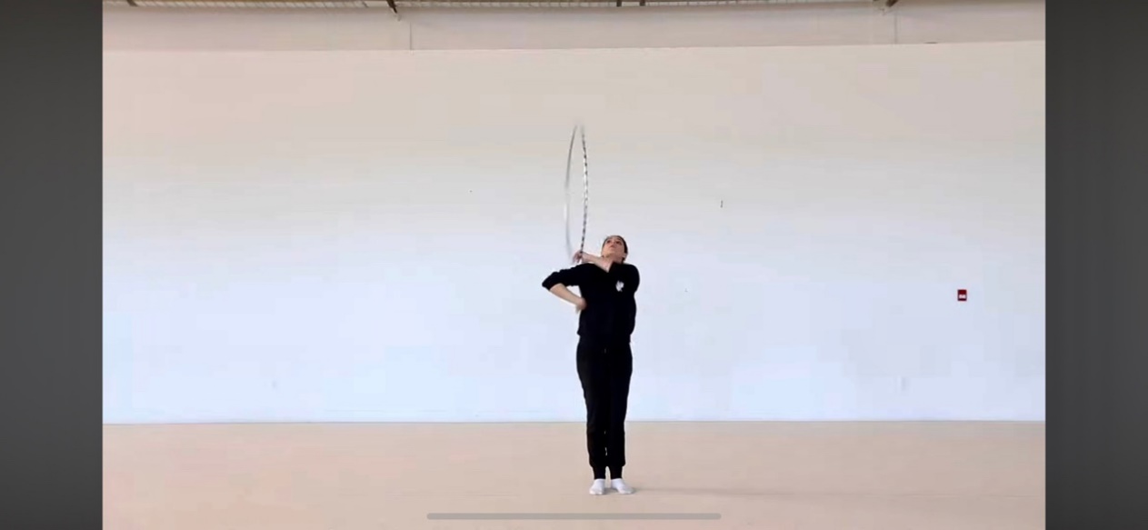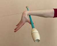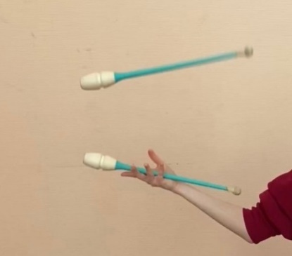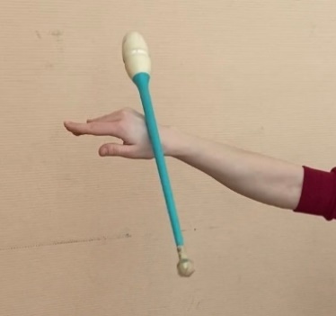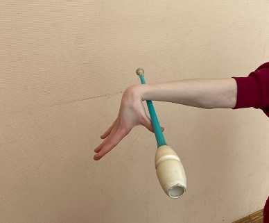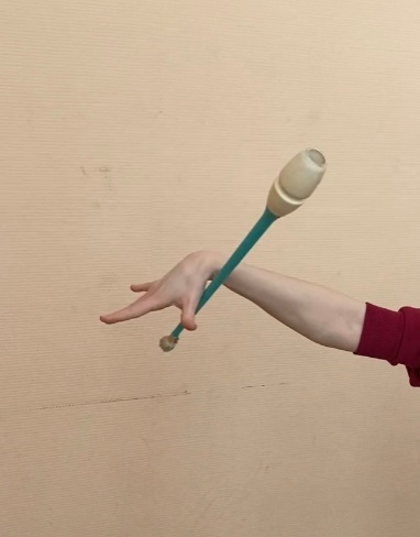 | ОМУ При конечном захвате руку держать точно вперед, не опускать и не сгибать к туловищу Упражнение выполнять правой и левой рукой, при жонглировании булава выполняет одинарный оборот. При выполнении упражнения не сходить с исходного места Сохранять горизонтальное положение булавы, рука зафиксирована, толчок выполнять за счет раскрытия кисти Обруч удерживается жестким хватом в боковой плоскости. При вращении обруча на большом пальце, остальные направлены вверх. Передача с одного пальца на другой происходит без остановки обруча. При передаче обруча рука сгибается в сторону. Упражнение выполнять без остановки, увеличивая скорость передачи. |