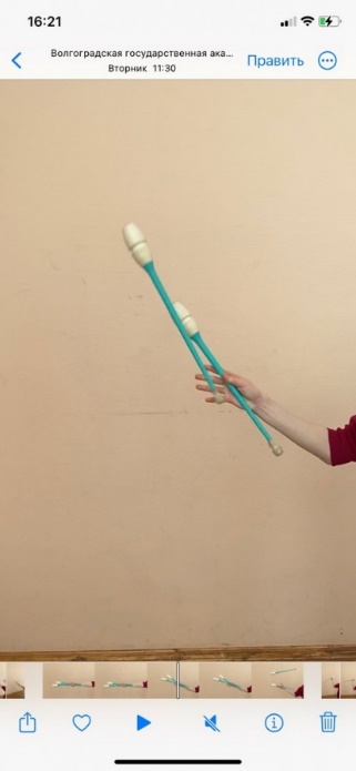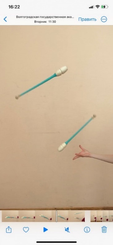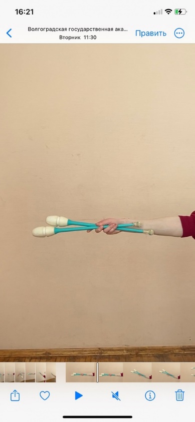 Содержание 1. И.п. - стойка ноги вместе, правая рука вперед, булава жестким хватом за тело в горизонтальной плоскости. Выполнить вращение булавы влево вокруг кисти. Далее захват булавы между предплечьем и большим пальцем кисти. 2. Жонглирование булавами одной рукой 3. Булава жестким хватом в правой руке, толчок булавы вверх и захват подушечками пальцев. 5. И.п.- стойка ноги вместе, правая рука вперед. Вращение обруча вперед на каждом пальце. Упражнение выполнить правой и левой рукой. 6. И.п.- стойка ноги вместе, правая рука вперед, вращение обруча вперед в боковой плоскости. Выполнить передачу обруча из-под плеча поочередно правой и левой рукой. | Графическое изображение