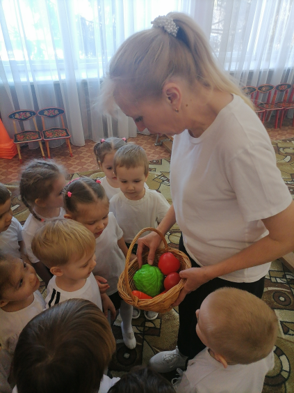 Воспитатель: Давайте вместе соберем все это в корзину и отнесем зверям в лес. (Дети собирают в корзину грибы, яблоки, шишки, морковь, капусту).