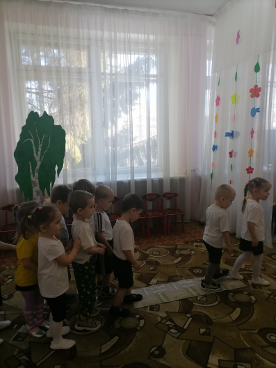 - Дети, на дороге мостик, надо его осторожно перейти.- Ручки в стороны разведем, по мостику все пойдем. - Ребята, посмотрите, кто это на дереве сидит? «Маленькая, рыженькая с пышным хвостиком?