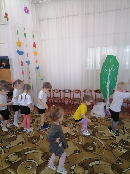 - создать радостное настроение, вызывать положительные эмоции, закрепить умение ходить в колонне по одному;
