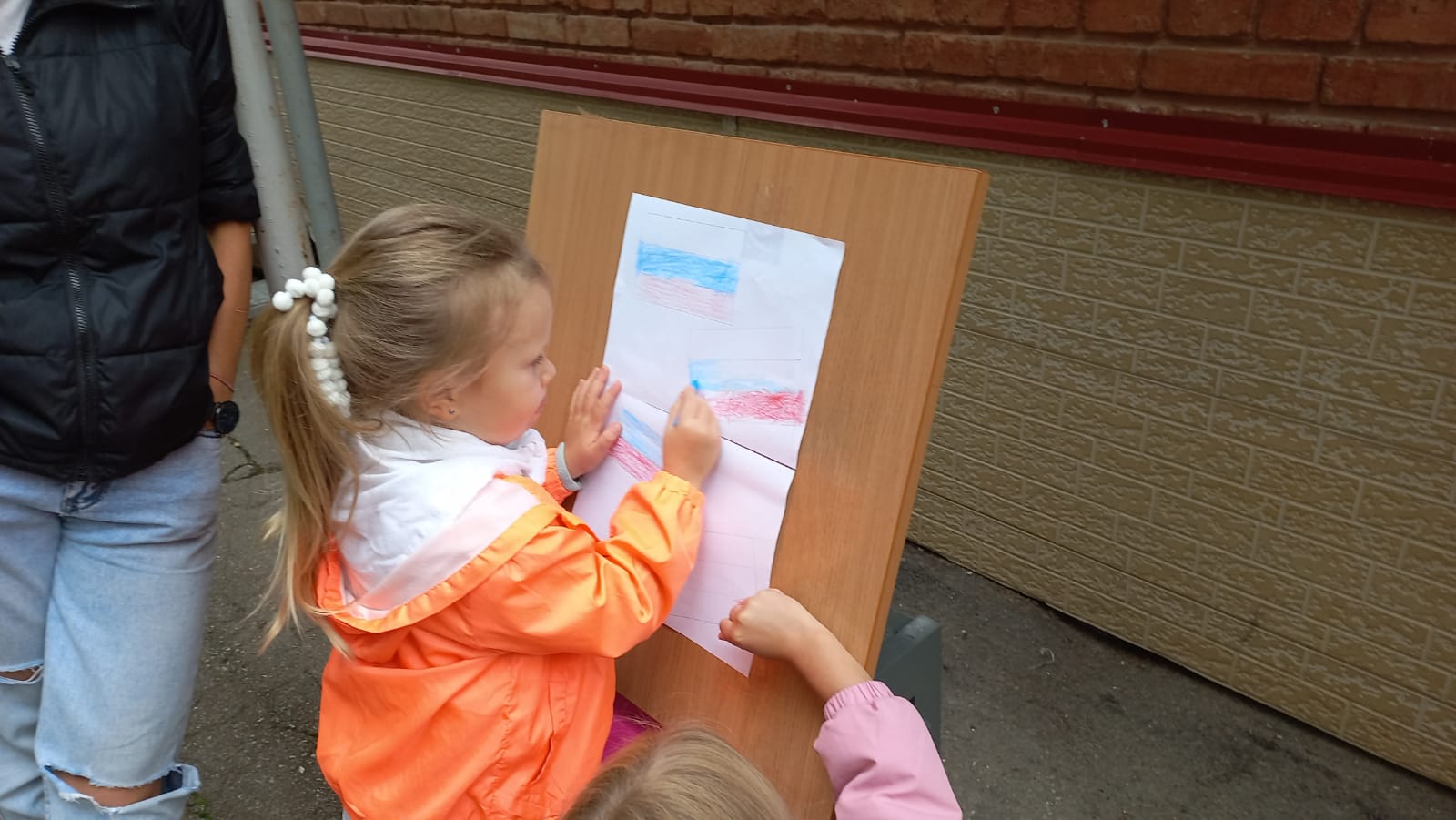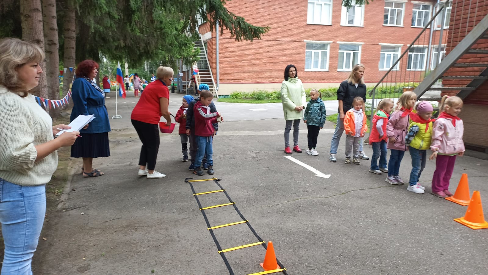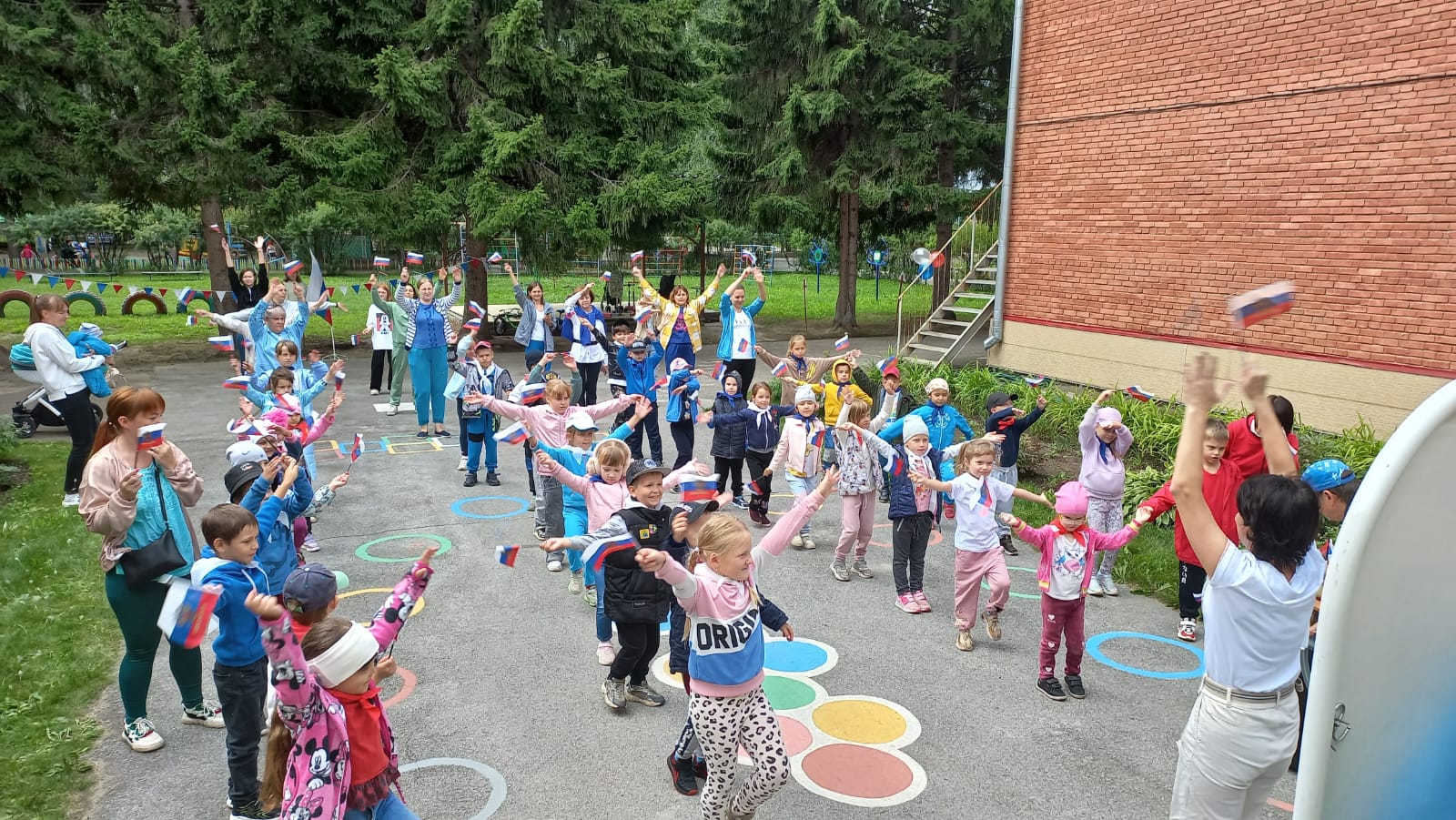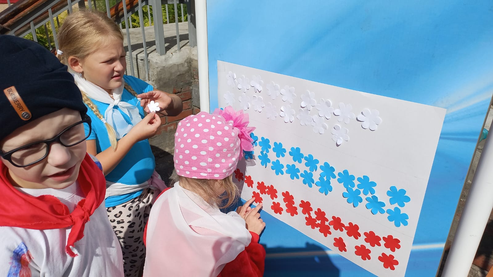Как только команды наберут по 100 очков, они меняются местами. После выполнения всех заданий ребятам и взрослым выдаются бумажные цветы, чтобы составить из них Российский флаг.