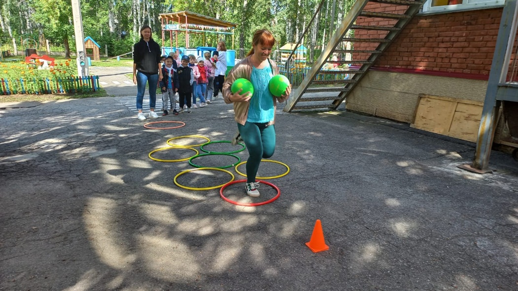 Инвентарь: конусы 10 шт.,2 больших мяча, обручи 15 штук.