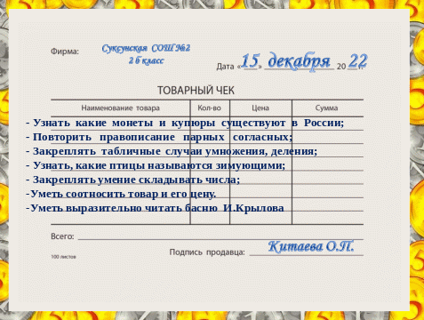 Представьте, вот лист - чек. Всё ли нам потребуется для урока, или что-то в этом чеке лишнее? (Ответы детей, лишние предложения удаляются)
