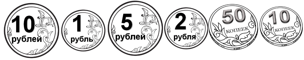 Монетки покатились и встали в шеренгу: 1 копейка, 5 копеек, 10 копеек, 50 копеек,