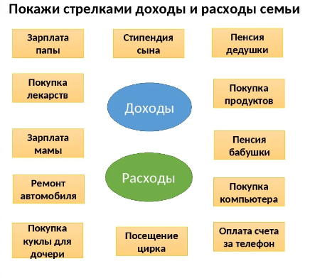 Решение поставленной проблемы | Уметь правильно распределять семейный бюджет | (Слайд 8) –Следующая улица «Бюджетная» (Слайд 9) -Что такое семейный бюджет? (Семейный бюджет – денежный план семьи. Общий кошелек семьи, в котором собираются все деньги) - Подумайте, из чего состоит семейный бюджет? (Из расходов и доходов) Расходы – затраты семьи. Доходы – все денежные поступления семьи. (Слайд 10) – Какие доходы и расходы в вашей семье? - Могут ли в семье появиться незапланированные и непредвиденные доходы? Какие? - Сейчас парами выполните задание. Соедините стрелками доходы и расходы семьи. ( обучающиеся меняются с соседними партами выполненными работами для проверки) Приложение 2 | Активизация мыслительной деятельности | Инициативное сотрудничество в поиске информации | Управление познавательными процессами | ||||||||