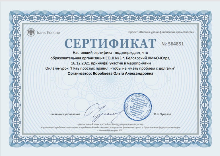 Мы приняли участие в онлайн-уроках: «С деньгами на «Ты» или Зачем быть финансово грамотным?», «Личный финансовый план. Путь к достижению», «Пять простых правил, чтобы не иметь проблем с долгами» (Приложение 5).