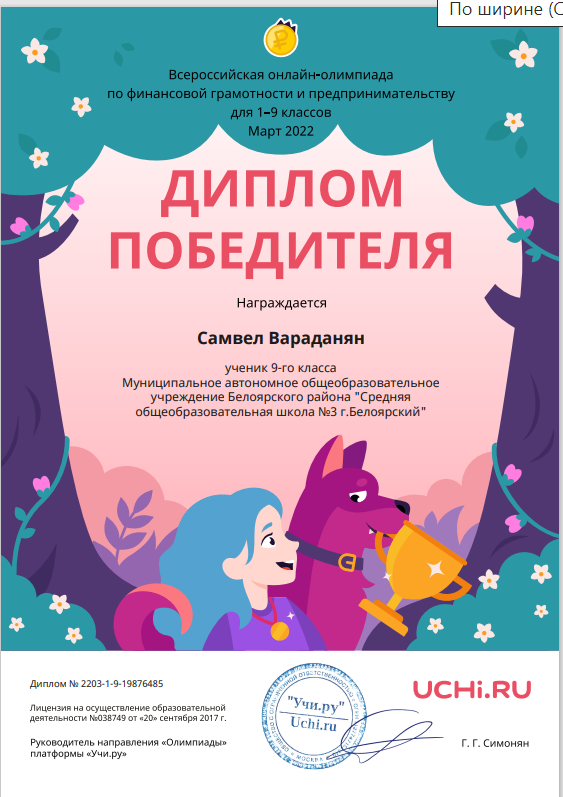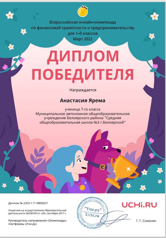 На образовательной онлайн-платформе Учи.ру при поддержке национального проекта «Малое и среднее предпринимательство и поддержке индивидуальной предпринимательской инициативы», Министерства экономического развития РФ, Центрального банка РФ и Ассоциации развития финансовой грамотности проводилась Всероссийская Олимпиада «Юный предприниматель и финансовая грамотность» в онлайн-формате. Почти все учащиеся моих классов приняли активное участие. Олимпиада была направлена на развитие нестандартного мышления, изучение основ финансовой грамотности, развитие предпринимательского и лидерского потенциала школьников. Задания олимпиады максимально приближены к ситуациям из реальной жизни и имеют практическую пользу (Приложение 6).