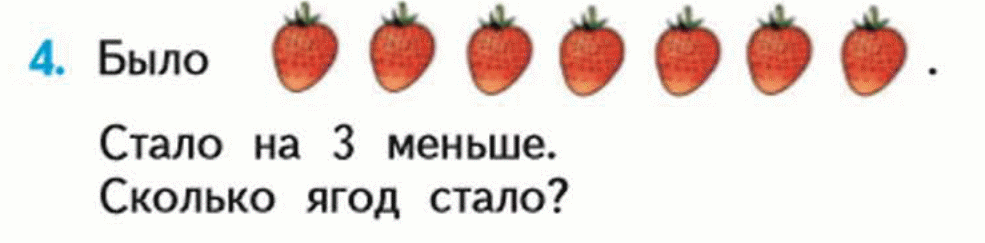 -О чём говорится в задаче? -Прочитайте только условие Изобразим 7 ягод красными кружочками в тетради. Как изменилось количество ягод? -Прочитайте вопрос. Покажем на схеме. Какое решение запишем? Как можно вычесть число 3? Какой следующий шаг? -Вспомните вопрос. Сформулируйте ответ. Прочитайте задачи, соотнесите каждую с соответствующим решением. Работаем в парах. | Под руководством учителя определяют цель урока и прогнозируют свою деятельность на уроке. Применяют правила совместной деятельности со сверстниками, проявляют способность договариваться, лидировать, следовать указаниям, осознавать личную ответственность и объективно оценивать свой вклад в общий результат; (Каждый имеет право высказать свое мнение, остальные должны его выслушать. В каждой группе должен быть ответственный. Он отвечает за работу всей группы, за результат. Работать в группе нужно так, чтобы не мешать другим группам.) выполняют арифметические действия сложение и вычитание в пределах 20; называют и различают компоненты действий сложения (слагаемые, сумма) и вычитания (уменьшаемое, вычитаемое, разность); решают текстовые задачи в одно действие на сложение и вычитание: выделяют условие и требование (вопрос); | Групповая Фронтальная Групповая |
