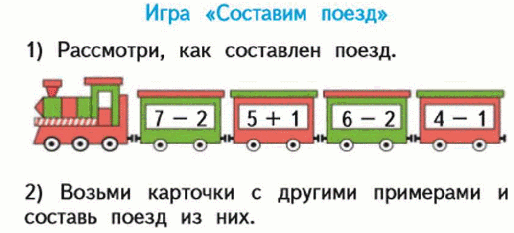 Этап изучения нового знания | Посмотрите на рисунок с жуками. Составьте по рисунку 4 примера. - Я предлагаю поработать вам в группах. Назовите правила работы. - У кого нет ответа? - О чём говорит ваш результат? (Мы не знаем способа прибавления числа 3) - Покажите ответы, у кого они есть. Учитель фиксирует на доске полученные учащимися варианты ответов. - Я вижу, что среди вариантов разные ответы. О чём говорит такой результат? (Мы допустили ошибки, нужно найти правильный способ решения.) - Давайте, сформулируем, как можно прибавить и вычесть число 3 по частям. Внимание на доску: 7+3= 6-3= 7+2+1= 6-2-1= 7+1+2= 6-1-2= Аналогично: 5+3= 5-3= Ребята, давайте вместе с вами придумаем свои числовые выражения на изучаемое правило и продлим поезд.