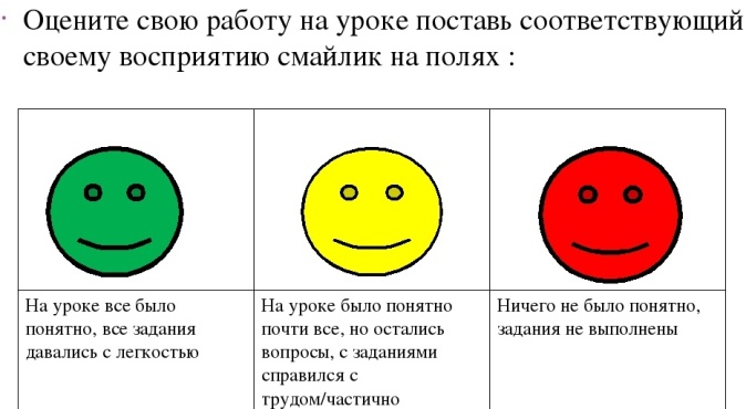 Этап рефлексии учебной деятельности | Вот и закончилось наше исследование. - Поднимите руку, кому было трудно на уроке? -Что нового открыли, узнали на уроке? -Оправдались ли ваши ожидания от урока? - Оцените свою деятельность на уроке, используя один из кружочков: зелёный, красный, жёлтый.