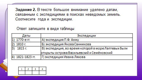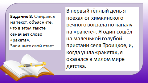 И задания, когда нужно дать определение или объяснить смысл термина, используя контекстную информацию. Например, не смогли объяснить смысл понятия «ракета» - знают космическую и военную, а в контексте – это было речное судно.