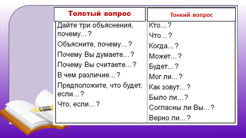 аботу начинали с записи в тетради характеристики тонких и толстых вопросов, их отличий.