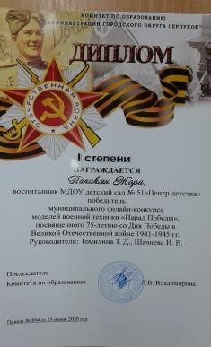 Родители группы приняли участие вмуниципальном онлайн – конкурсемоделей военной техникии заняли 1место.